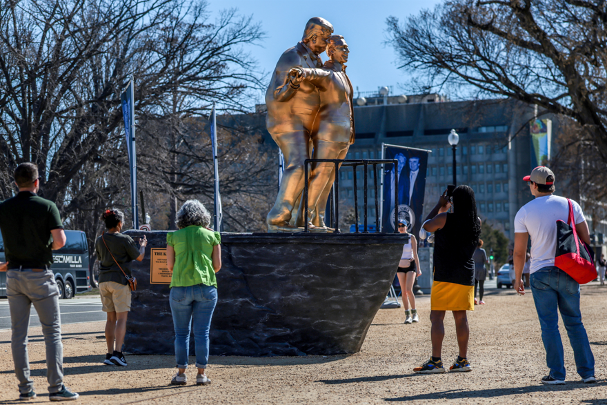 Anonim sanatçı kolektifi Secret Handshake'in yeni heykeli, Trump'ın Epstein ile ilişkisini eleştiriyor.