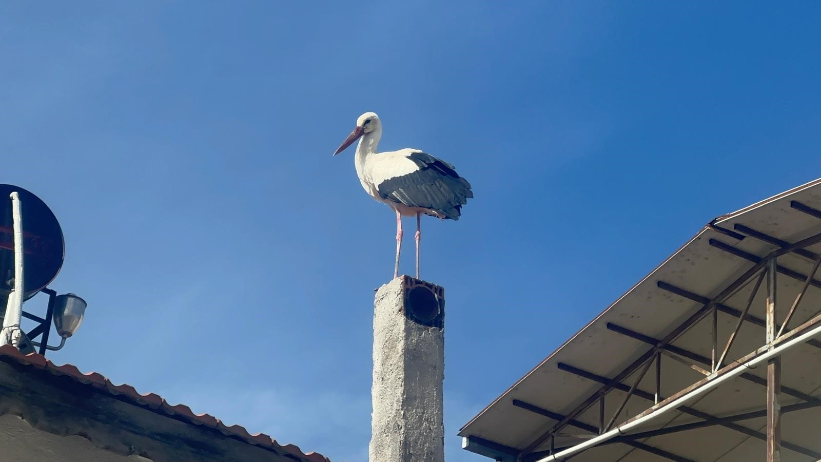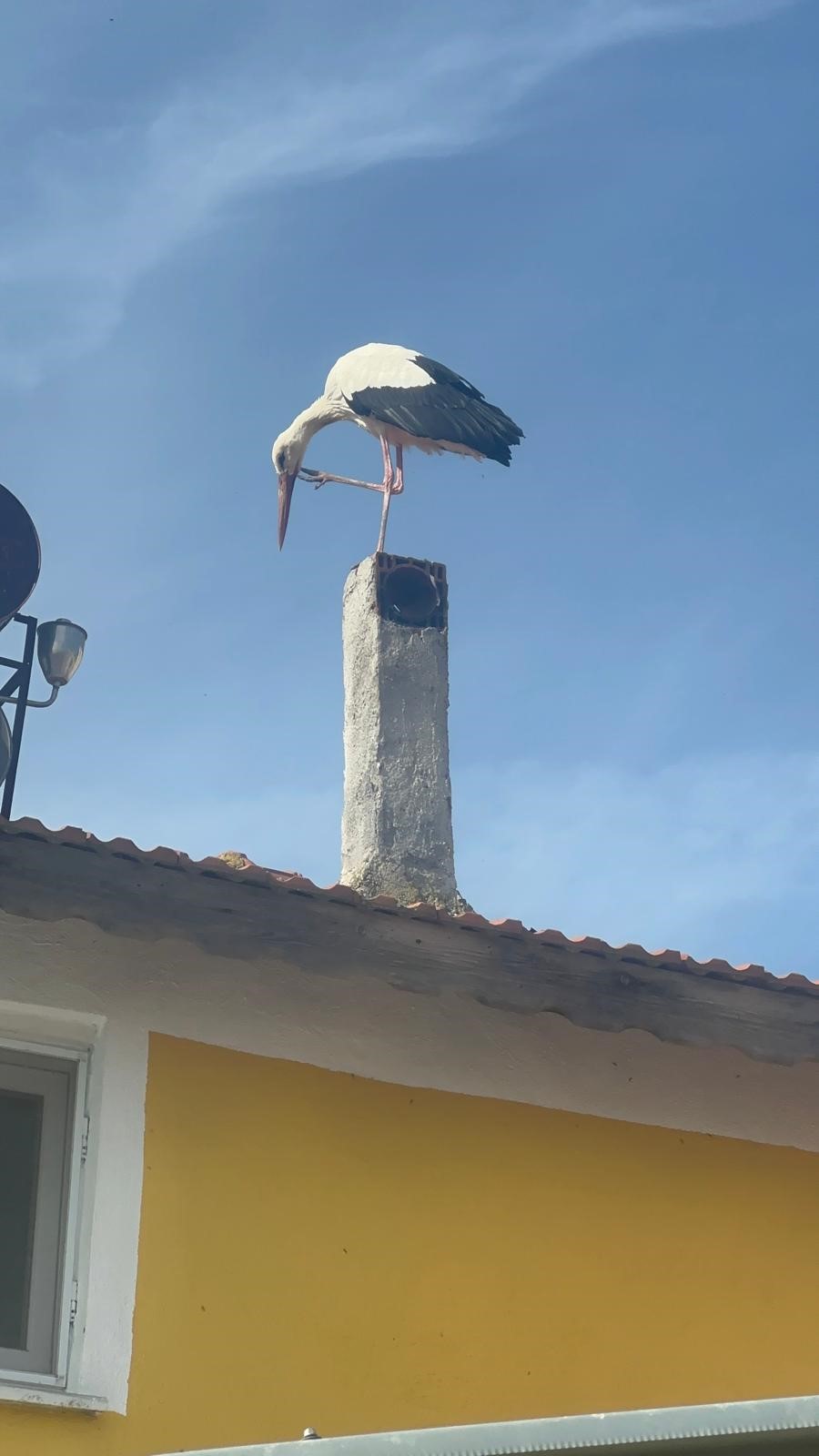 Adem Yılmaz'ın evinin bacasına ve çatısına konan leylek, Eskikaraağaç Mahallesi sakinlerini de heyecanlandırdı.