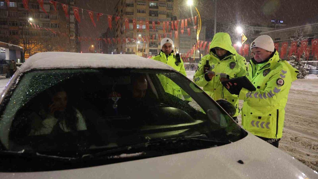 Elazığ'da 2026 yılına girerken şehrin birçok noktasında İl Emniyet Müdürlüğü Trafik Denetleme Şube Müdürlüğü tarafından uygulama yapıldı. Kış lastiği, evrak, ehliyet, alkol, emniyet kemeri ve egzoz kontrolü yapan ekipler, sürücülerin yeni yılını kutlayarak trafik kuralları hakkında bilgiler verdi.