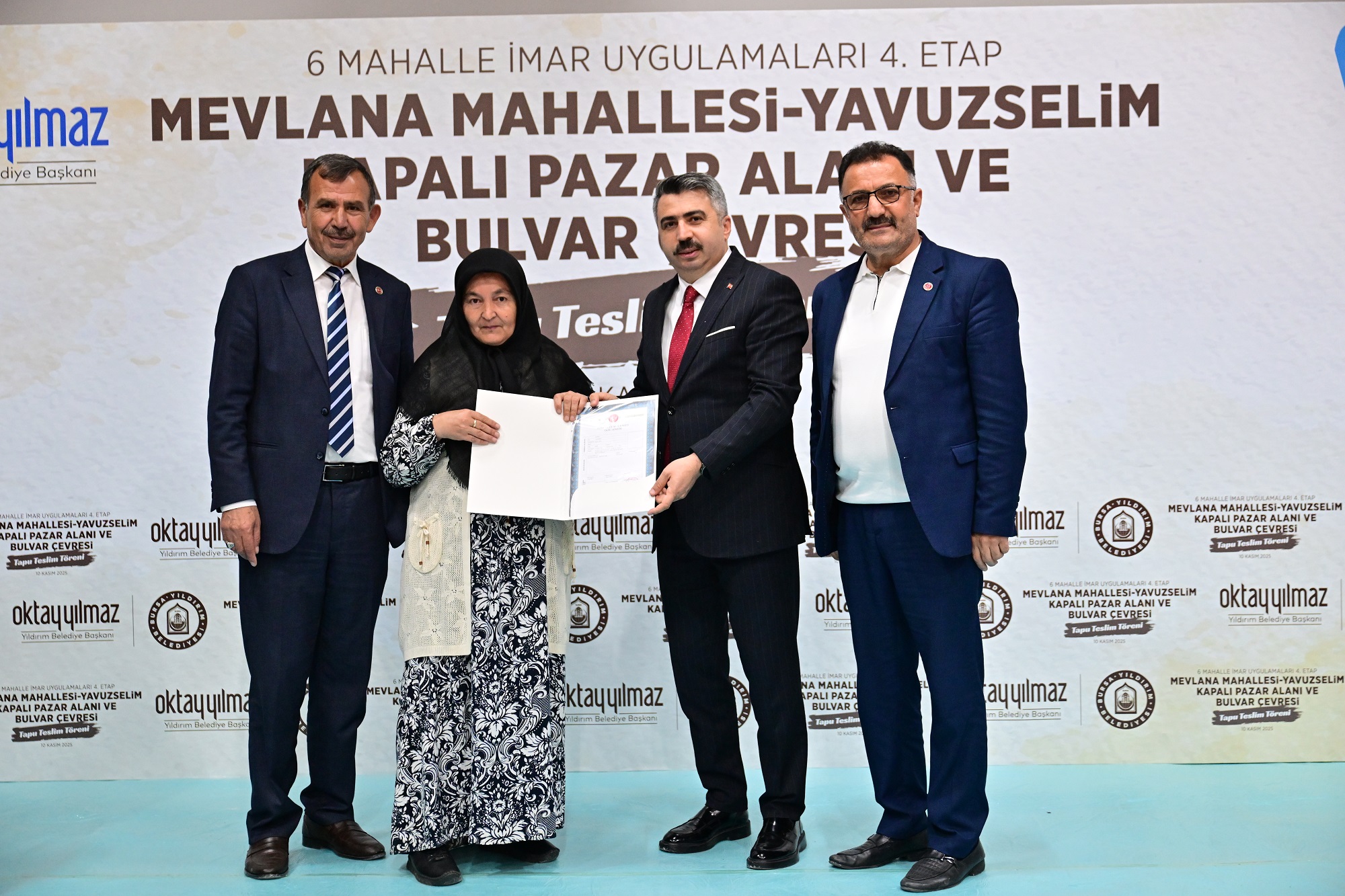 Arabayatağı, Çınarönü, Ulus, Yavuzselim, Mevlana ve Hacivat mahallelerini içerisine alan 300 hektarlık alanda uzun yıllardır devam eden imar ve mülkiyet düzenlemelerine kararlılıkla sahip çıktıklarını vurgulayan Yıldırım Belediye Başkanı Oktay Yılmaz, “Çalışmalarımızı 4 etap hâlinde planladık. 1. Etapta 251, 2. Etapta 4 bin 166, 4. Etap kapsamında bugün 1 bin 550 olmak üzere, toplam 5 bin 867 hak sahibinin tapusunu teslim ettik. 3.Etapta ise imar uygulamalarını tamamladık. Bu 18 bin 950 tapunun Tapu Tescil Müdürlüğü’nde tescil edilmesinin ardından kısa süre içerisinde dağıtımını gerçekleştireceğiz. Böylece, 24 bin 817 dönüşüm tapusu üretmiş olacağız. Bu, Yıldırım'ın geleceğini değiştiren büyük bir adımdır” ifadelerini kullandı.