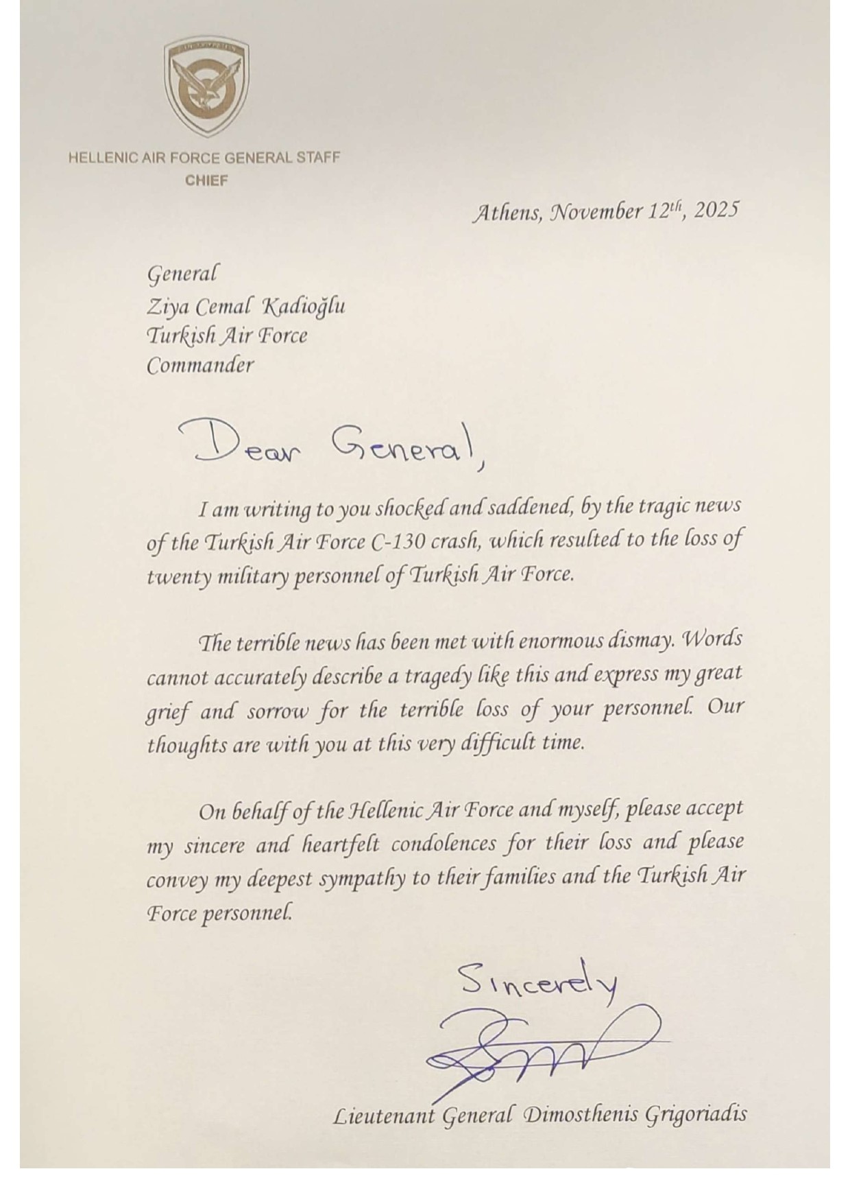 Mesajda, "Sayın General, Türk Hava Kuvvetleri'ne ait C-130 tipi uçağın düşmesi sonucu 20 Türk Hava Kuvvetleri askerinin hayatını kaybetmesiyle sonuçlanan trajik haberi duydum. Şok ve üzüntü içinde size yazıyorum. Bu korkunç haber büyük bir üzüntüyle karşılandı. Kelimeler böyle bir trajediyi tam olarak anlatamaz ve personelinizi kaybetmenin verdiği büyük acıyı ve üzüntüyü ifade edemez. Bu zor zamanda düşüncelerimiz sizinle. Yunan Hava Kuvvetleri ve şahsım adına, lütfen içten ve samimi taziyelerimi kabul edin, ailelere ve Türk Hava Kuvvetleri personeline en derin taziyelerimi iletin" ifadeleri yer aldı.