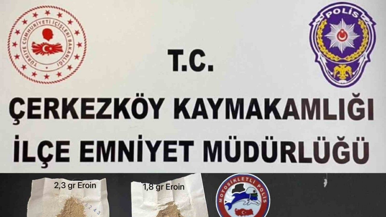 Çerkezköy Emniyet Müdürlüğü Narkotik Suçlarla Mücadele Şubesi ekiplerinin denetim ve operasyonlarda 10,6 gram eroin, 126 adet galara hap, 7 adet satışa hazır halde skunk, 3 adet lyrica hap, 20 adet farklı boyutlarda peçeteye emdirilmiş A-M maddesi, 5,72 gram esrar ve 0,5 gram taş kokain bulundu.